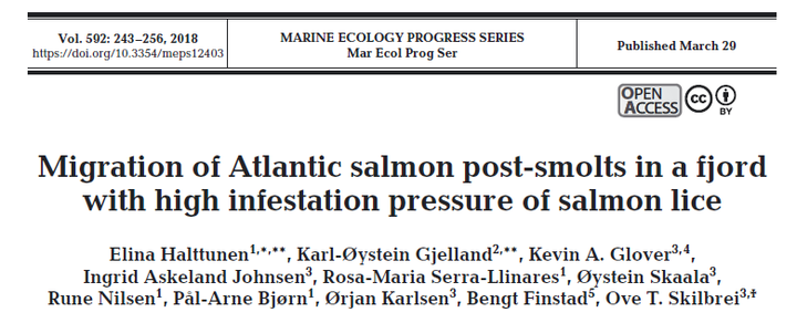 Salmon lice Lepeophtheirus salmonis Krøyer may affect survival and growth of anadromous salmonids through physiological stress and/or behavioural changes. Using acoustic telemetry tracking, we investigated the behaviour of 30 infected sea trout Salmo trutta throughout the summer in a fjord with very high salmon lice infection pressure. Most of the tracked sea trout adopted a movement pattern expected to suppress salmon lice infestation, as they showed a strong preference for fresh or brackish water, spending most of the time close to a river outlet or even migrating into the river. Highly infested sea trout preferred shallower depths, associated with lower salinity. The fish lost to predation stayed further away from the river outlet than non-predated fish, and were likely subjected to a stronger infection pressure. Half of the tracked group were treated with a salmon lice prophylaxis, emamectin benzoate. The effect of treatment on infestation was monitored in a separate group held in a sea cage and found to be moderate; the mortality in this group was associated with infestation by motile lice stages. In contrast, treatment was not found to have an effect on tracked fish behaviour. It is likely that some physiological and behavioural responses to high salmon lice infection pressure may be present even after a prophylaxis treatment, in particular when the treatment is given after exposure to salmon lice infection. We conclude that increased salmon lice infection pressure associated with altered salmon farming practice may have the potential to influence the marine behaviour and growth of sea trout.