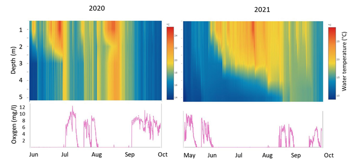 Temporary summer stratification is probably a common, but easily overlooked phenomenon in many shallow lakes, because short-term temperature stratification and mixing events are not easily discovered by routine samplings. We used two years of high frequency measurements and monitoring of 5-m deep and hypereutrophic Lake Ormstrup, Denmark to study the dynamics of temporary stratification and its effects on oxygen concentrations, nutrient cycling, greenhouse gas emissions and fish habitat use. Temporary stratification followed by complete mixing of the water column occurred several times each summer, but its duration was highly variable between years despite only small climatic variations. Anoxia at depths greater than 2–3 m developed within a few days after stratification. During anoxia fish accumulated in the upper 2 m and high accumulation of phosphate (up to 1.34 mg/l), ammonia (up to 2.32 mg/l) and greenhouse gases (methane up to 5 mg/l) occurred at depths greater than 2–3 m that were released at mixing. Lake Ormstrup is an example of how very dynamic, unpredictable, and variable mixing conditions develop each summer with significant implications for fish habitat use, nutrient dynamics and greenhouse gas emissions. This might adjust our view of these lakes in a management and climate change perspective.